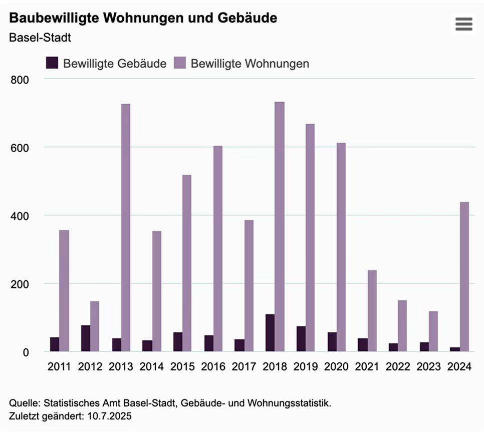 Gleichzeitig wurden nach einer Phase mit weniger Bewilligungen (2021–2023) viel mehr Baubewilligungen für Wohnungen erteilt. Der aktuelle Wert liegt im Durchschnitt der vorangegangenen zehn Jahre.